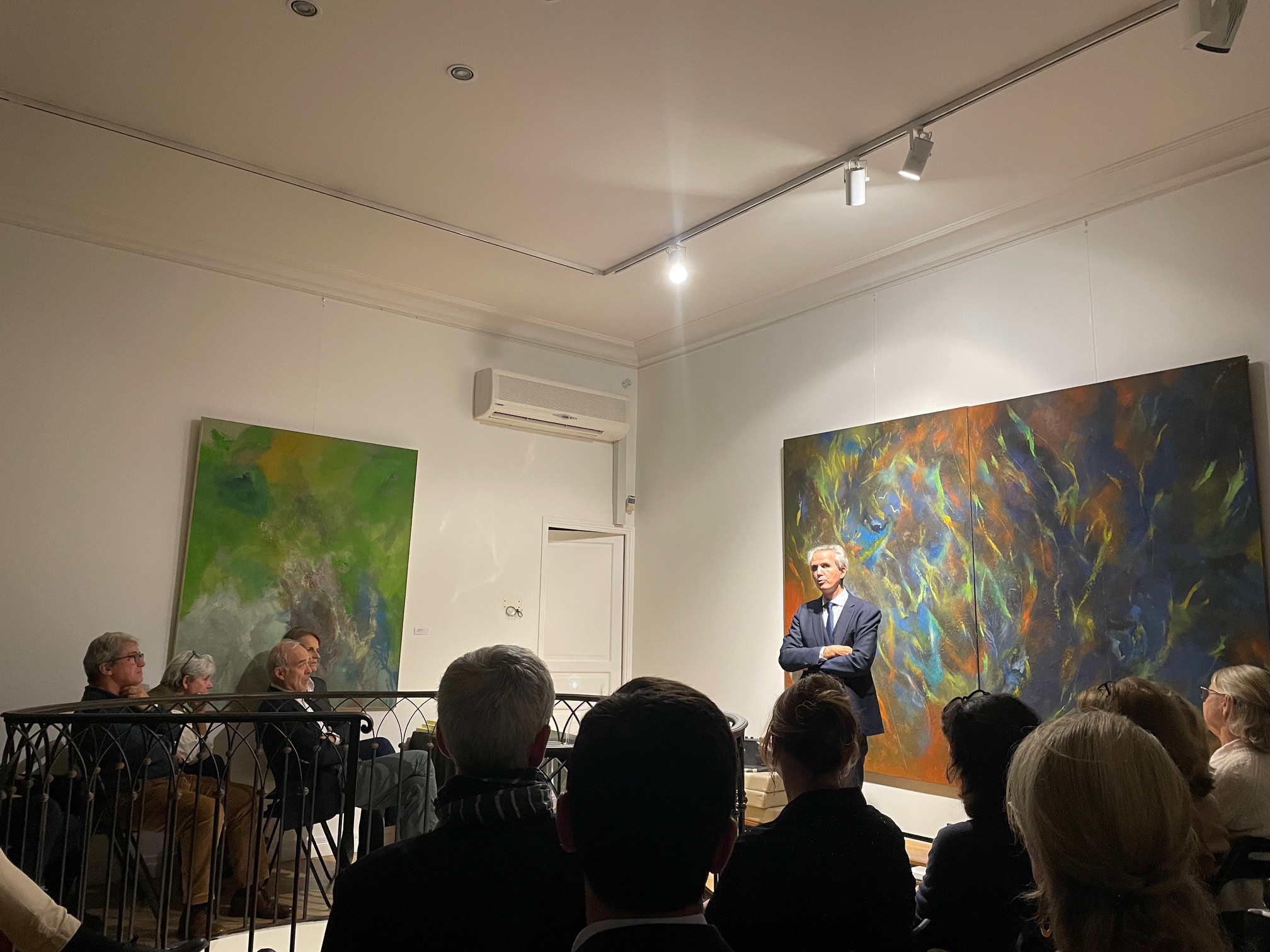 La Galerie Guillaume a été très honorée de recevoir le professeur Raphaël Gaillard, nouvel invité des Rencontres de la galerie, cette année sur le thème « Perspectives ». En effet, le parcours de Raphaël Gaillard est remarquable : fils d’une professeure d’allemand et d’un psychanalyste, issu d’une famille dans laquelle la musique et la littérature étaient des valeurs essentielles et des pratiques quotidiennes, Raphaël Gaillard a un double « cursus » de normalien et de psychiatre. Il dirige actuellement le pôle hospitalo-universitaire de psychiatrie de l’hôpital Sainte-Anne et est professeur de psychiatrie. Dans son métier qui n’est pas rien (Sainte-Anne reçoit 12000 patients par an), Raphaël Gaillard s’attache « à trouver les mots justes, car parfois un seul mot permet de mettre en harmonie le psychiatre et le patient, il y a quelque chose de musical à ce moment, il y a une harmonie, c’est un moment d’accordage de grâce pour le psychiatre ». Avec des mots simples, Raphaël Gaillard parle des liens entre folie et créativité qu’il explore dans un livre passionnant « Un coup de hache dans la tête » (2022, Grasset), mais aussi des effets de l’IA sur nos cerveaux « soumis à très rude épreuve », qu’il détaille dans « L’homme augmenté, futurs de nos cerveaux » (2024, Grasset). Raphaël Gaillard, homme complet, a été élu à l’Académie française en 2024.