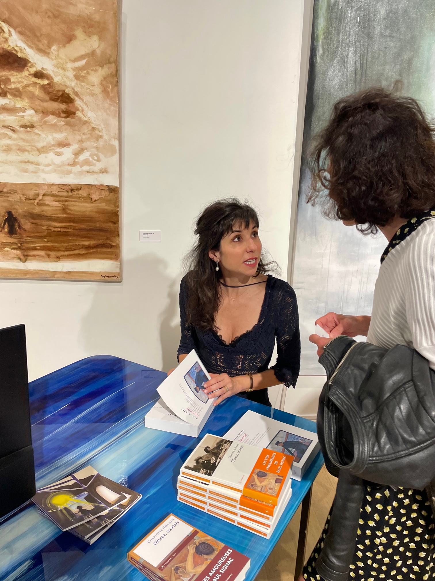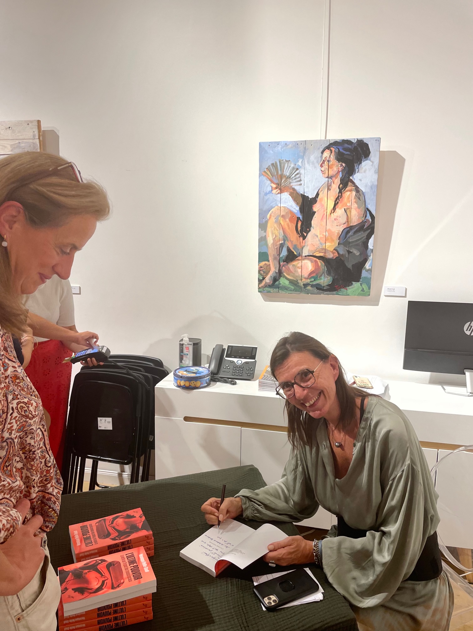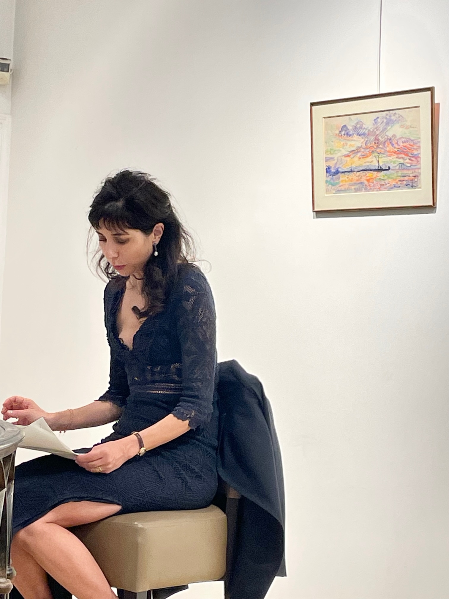 La galerie a accueilli Charlotte Hellman Cachin. Elle est l’arrière-petite-fille de Signac et la fille de Françoise Cachin, qui fut une grande directrice du musée d’Orsay et des musées de France. Depuis la mort de sa mère, Charlotte Hellman, seule descendante directe du peintre, a repris la gestion du fonds et des archives Signac. C’est à ce titre qu’elle est venue à la galerie lire des extraits du journal de son arrière-grand-père, autour de la lumière. Devant une aquarelle représentant le Port de Saint-Tropez peinte par Signac en 1905. Cette lecture, belle et émouvante, était en lien avec l’exposition « Avec la lumière… » qui se tient actuellement à la galerie dont le commissaire est Olivier Kaeppelin, avec entre autres des œuvres Bang Hai Ja et de François-Xavier de Boissoudy.