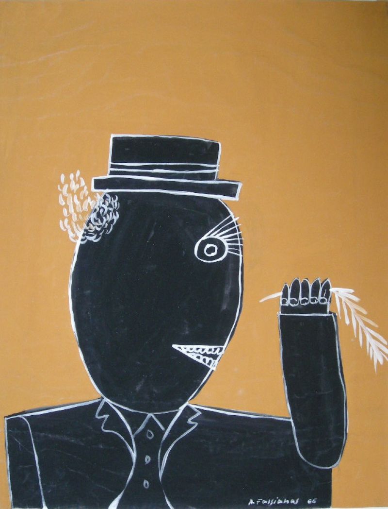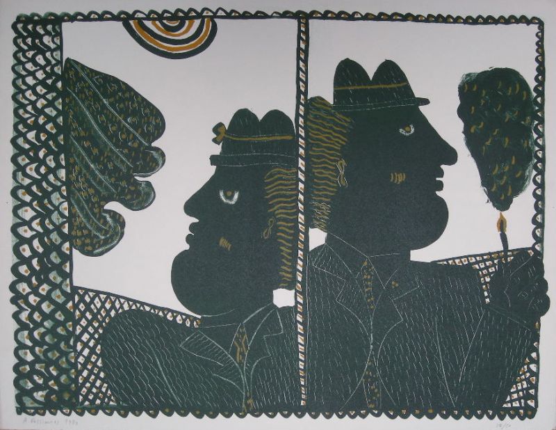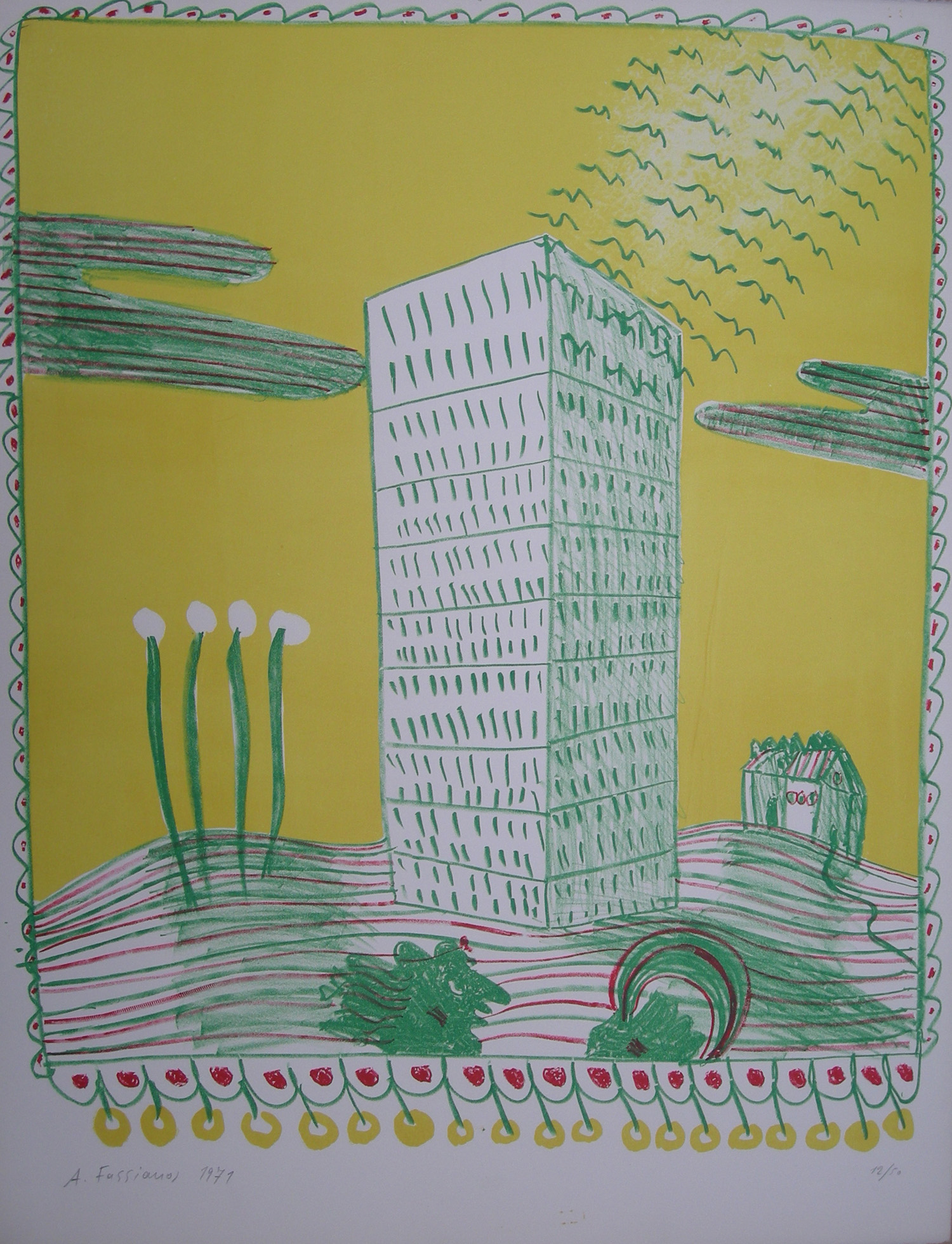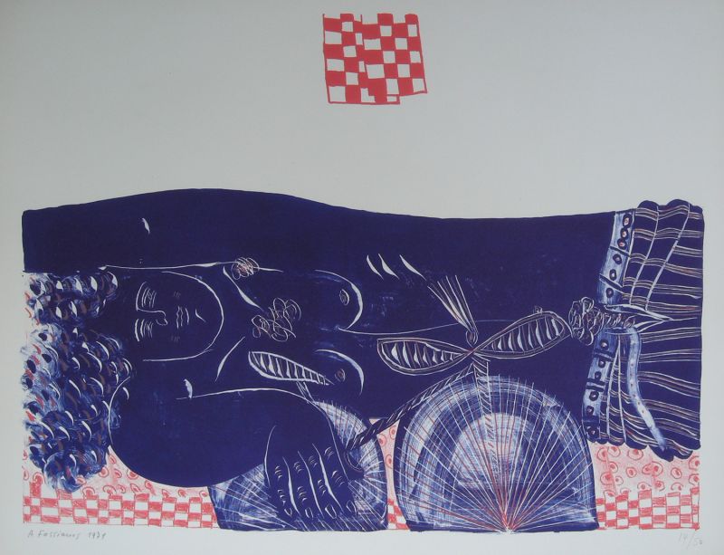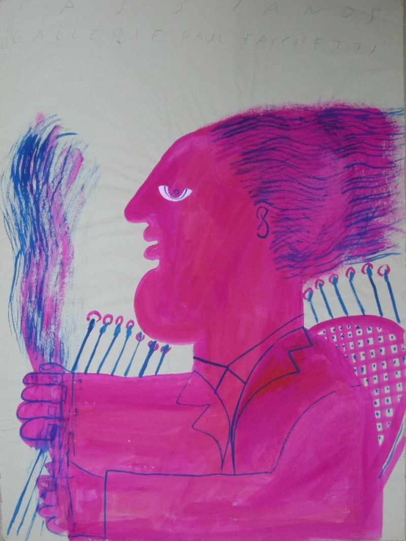 Né en 1935, Alecos Fassianos étudie à l'Ecole des Beaux-Arts d'Athènes. Détenteur d'une bourse, il séjourne à Paris pendant trois ans et étudie la technique de la lithographie. Il décide de s'exiler définitivement à Paris lors de l'avènement de la dictature des Colonels en Grèce en 1967. Frappé par la singularité de son œuvre, Paul Facchetti l'expose dès 1969, et édite une série de gravures et de lithographies exécutées entre 1968 et 1971. Comme l'a écrit Pierre Cabanne: « Fassianos habite un pays mythique qui se situe mal sur la carte, mais est voué à la clarté éblouissante du soleil, aux parfums des fleurs, au bruissement du vent tourbillonnant autour des oiseaux dont le plumage est couleur d'arc-en-ciel. Dans ce pays où se dressent des temples rongés de lumière, où les plus belles légendes du monde et le culte des héros ont trouvé place, Fassianos a imaginé que pouvaient revivre ces héros et ces dieux, mais se rencontrer aussi des amoureux à bicyclette, passer des baigneuses aux gros seins ronds et au ventre plat, toujours échevelées, se mesurer des athlètes musclés à des cavaliers brandissant des écharpes comme des trophées, des éphèbes au torse lisse qui tendent, la cigarette aux lèvres, des bouquets de fleurs ou des épis de blé à d'improbables partenaires ».