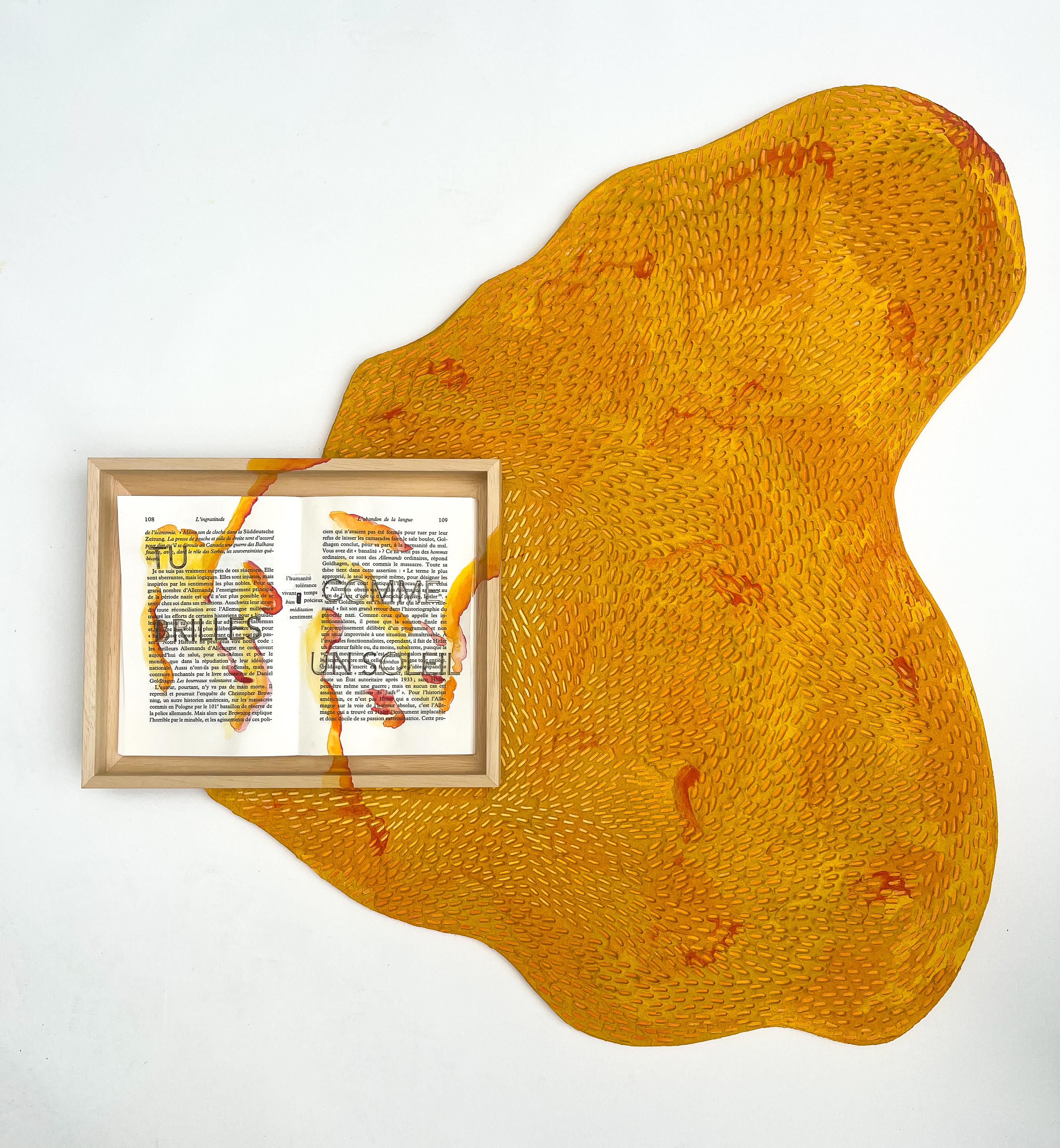 , technique mixte avec découpe, acrylique sur toile et aquarelle sur livre, dispositif sonore