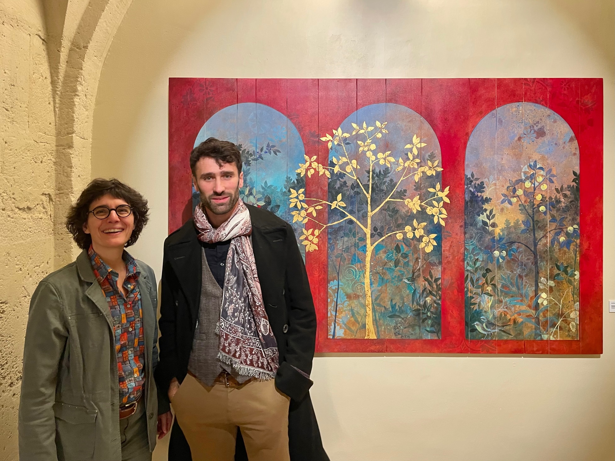 Événement, émotion et fierté cette semaine pour Augustin Frison-Roche : son premier tableau dans un musée français ! Son œuvre « Paradis » est en effet la seule œuvre contemporaine présentée au musée Maurice Denis de Saint-Germain-en-Laye dans la très belle exposition « Les chemins de la Nature » qui montre l’importance de la nature dans l’œuvre du célèbre artiste Nabi. C’est Fabienne Stahl, commissaire de l’exposition et spécialiste de l’œuvre de Maurice Denis qui a fait visiter l’exposition en présence d’Augustin Frison-Roche (photos). Augustin Frison-Roche est actuellement aussi présenté dans l’exposition « L’arrière-monde » à la Galerie Guillaume (commissaire : Raphaëlle Ziadé, conservatrice des arts byzantins au Petit Palais).